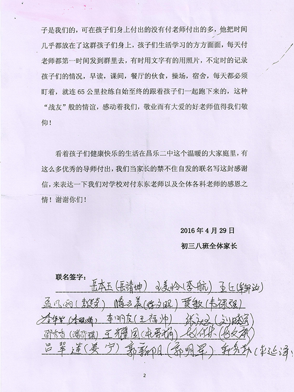 我校初三八班首席导师付东东工作敬业而有大爱,为孩子真心付出、辛苦引导,有强烈的责任心和奉献意识;积极主动地与家长沟通、交流,让家长第一时间了解孩子在校学习生活的方方面面,让家长们深受感动。初三八班学生家长联名写了一封感谢信寄到学校,表达对付东东老师及全体各科老师的感恩之情,感谢学校对孩子全方位的关爱与培养。