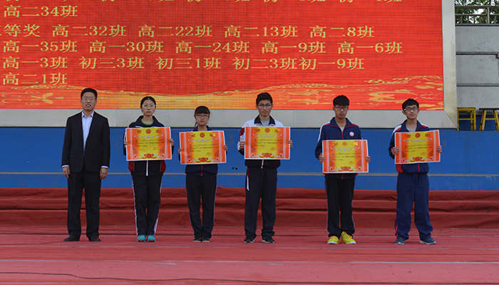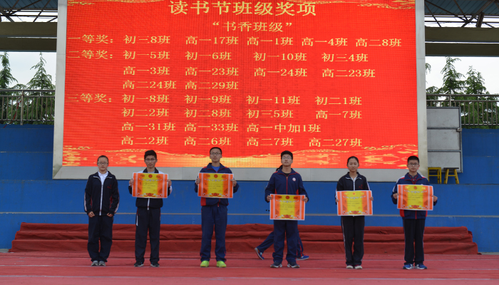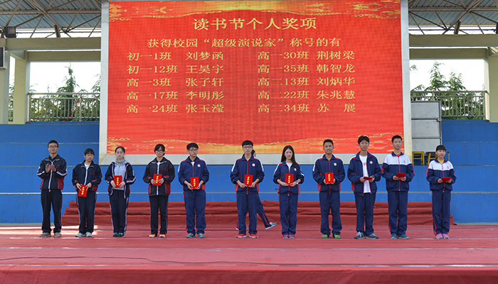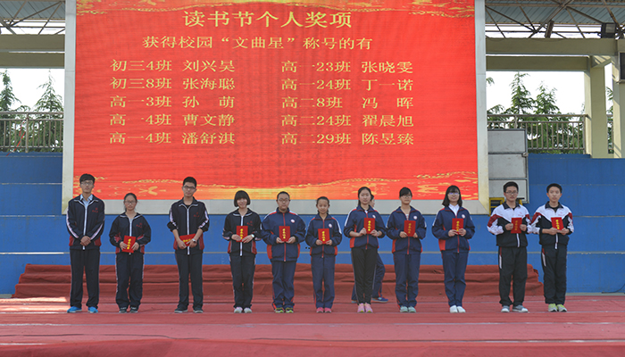 4月17日下午,我校第六届读书节闭幕式暨颁奖典礼在学校运动场隆重举行,学校副校长徐凯林、刘金明、刘欣、王建磊,国际部主任张文婷、学生成长中心主任李康及学生会主席宫智维、学代会委员长郭诚、社团联盟主席张鑫等学生领袖出席,初中部、高一年级、高二年级全体师生参加。