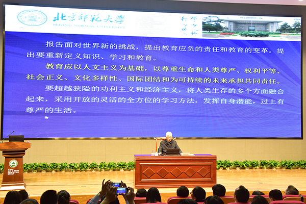 5月7日上午,国家教育咨询委员、中国教育学会会长、北京师范大学教授顾明远于271教育集团研发培训中心报告厅作"对教育本质的新认识"主题报告,强调教育要超越经济发展的功利主义,以人文主义为基础。教育是全球共同利益,要以全方位的终身学习方式应对全球学习变化,为所有人创造发展潜能的机会。教育要把培养人的事业与人类未来可持续发展联系起来,回归教育本源,把立德树人作为教育的根本任务,使我们的年轻一代能够承担起可持续的未来责任。