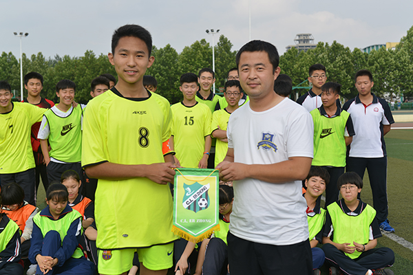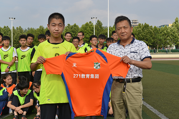 16日,我校高中男女足球队将代表昌乐县参加潍坊市中学生足球比赛,出征前,高主席一行为同学们颁发队服并授旗,高主席还从比赛安全、足球精神等比赛注意事项方面与同学进行交流,对同学们作指导,为同学们加油鼓劲。