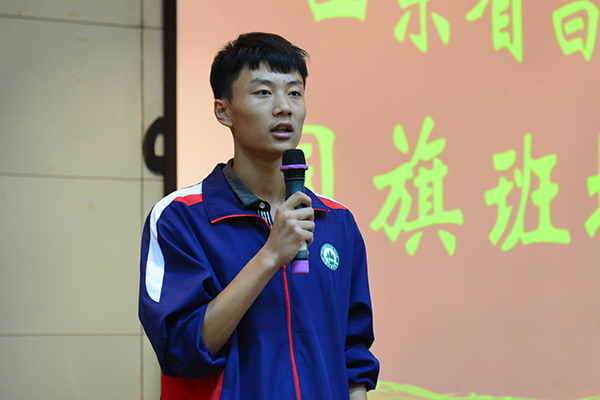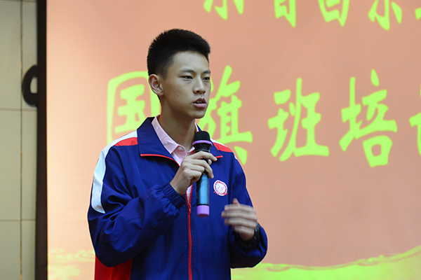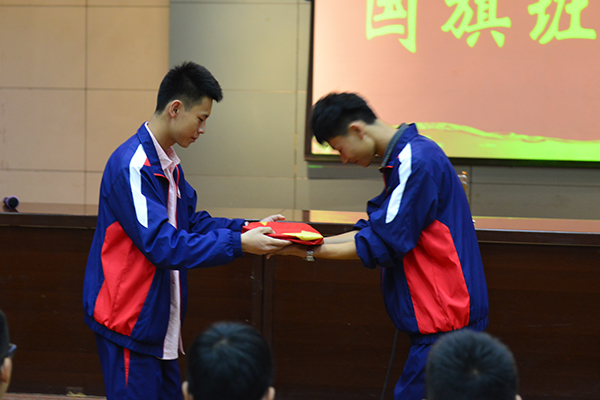 会上,2015届国旗班班长赵百川同学与大家分享了一年来的成长和收获,希望2016届国旗班的工作能够比2015届国旗班做的更好。2016届国旗班班长从责任和荣誉两个方面谈了自己的认识,他坚信新一届国旗班将不负众望,以全新的姿态展示"昌乐二中第一班"的风采。随后,新老国旗班完成了交接仪式。最后,刘欣副校长做了培训,她首先肯定了前一届国旗班的做出的成绩,同时她希望2016届国旗班要发扬国旗班精神,要求同学们要扎实训练,增强责任心,努力让自己成长为最好的自己。
