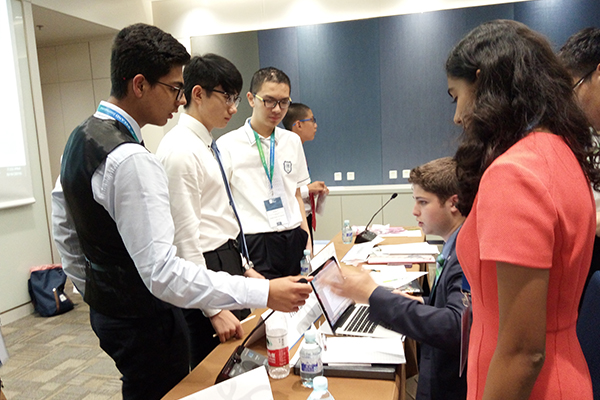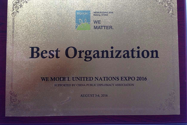 2016年8月3日至6日,我校师生17人在北京雁栖湖国际会展中心参加了全球青年模拟联合国大会2016 (WE Model United Nations EXPO 2016),并取得山东省内中学代表队中最好成绩。本次大会由中国公共外交协会支持,会期四天,来自中国、美国、英国、韩国、印度等世界各地1000人参加了宾夕法尼亚大学、康奈尔大学、牛津大学、芝加哥大学、波士顿大学等模联的分会场讨论。