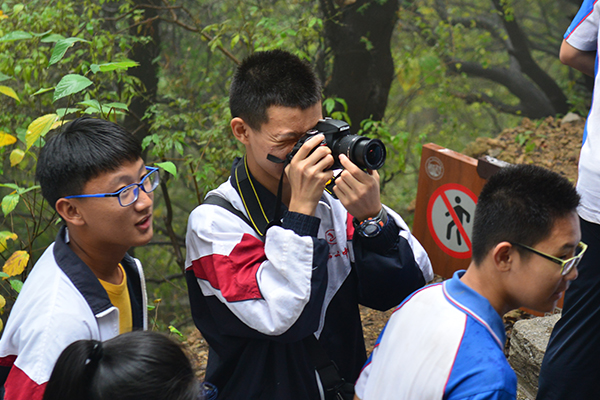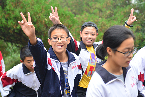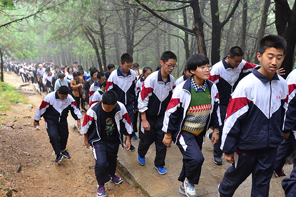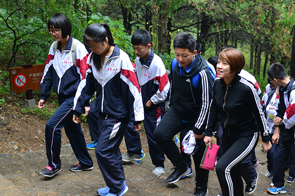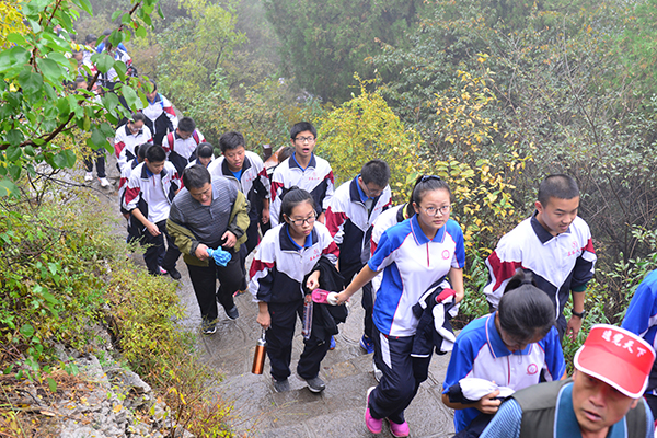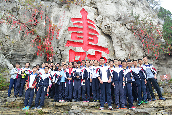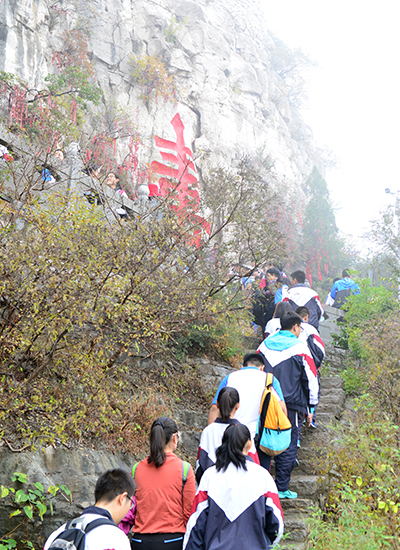 经过大概一个小时的车程,同学们到达了云门山。早晨一阵小雨过后,云门山间若隐若现,虚无缥缈,宛若仙境,蔚为壮观。云门山为历代名人所重视,山上断崖峭壁间遍布了文人名士的题刻和碑碣,同学们边爬山边品味。在云门山巅之阴,有一海内罕见的巨大摩崖石刻"寿"字,人称"云门献寿"。 大"寿"字字体结构严谨,端庄大方,同学和老师们纷纷在字下合影留念,以表达对彼此最美好的祝福。