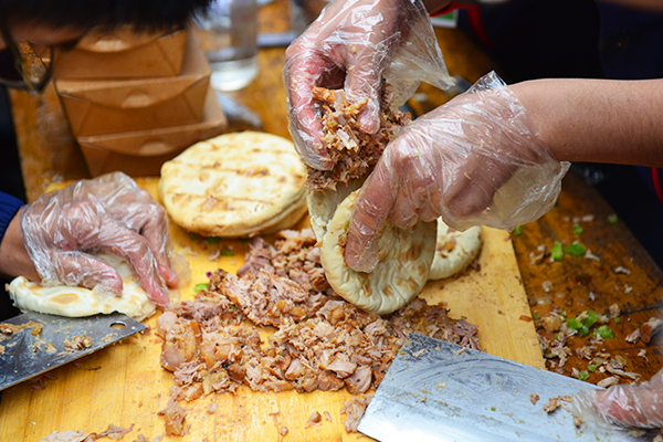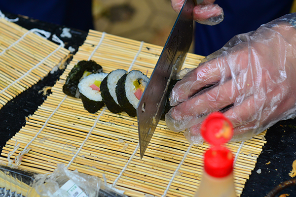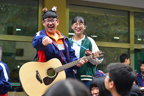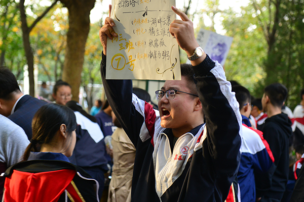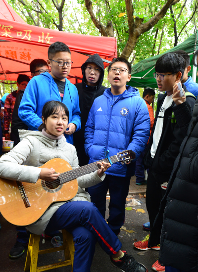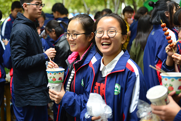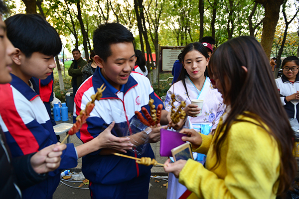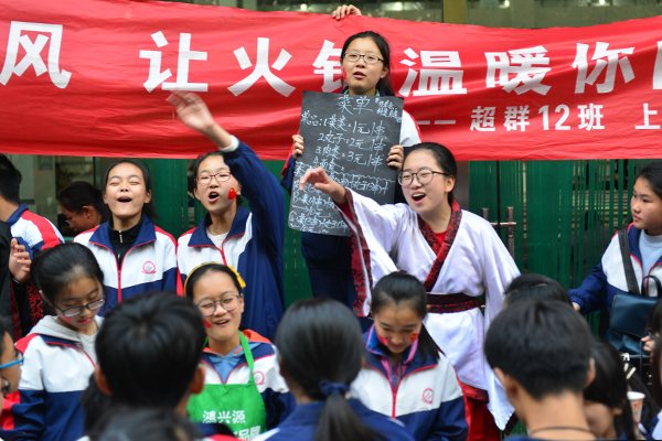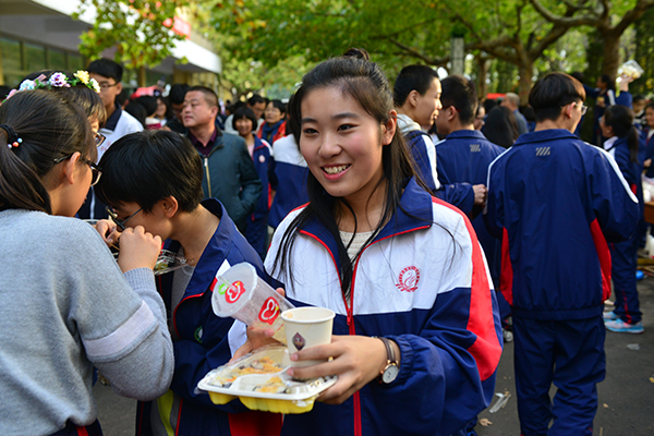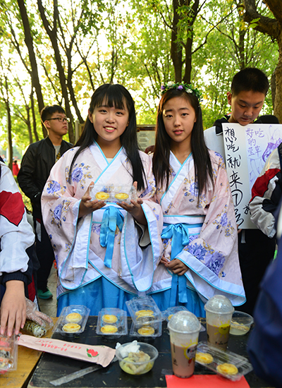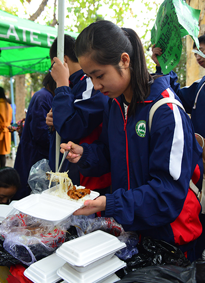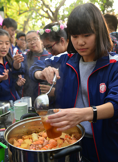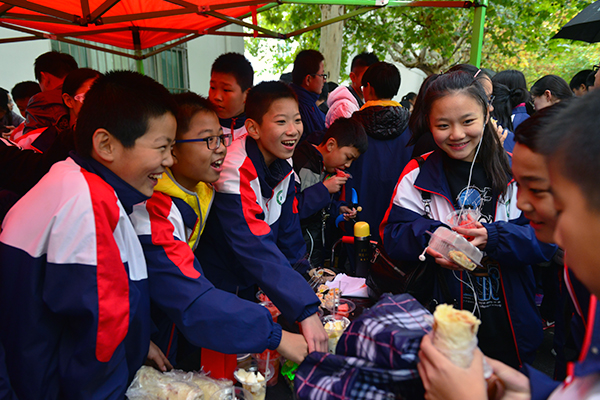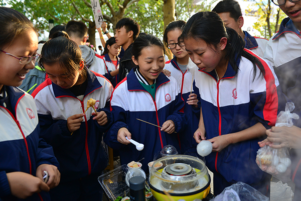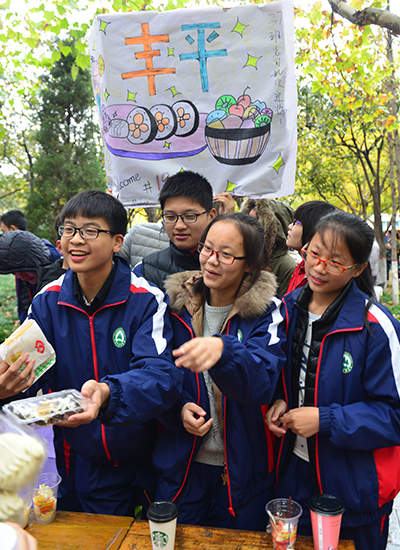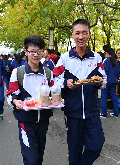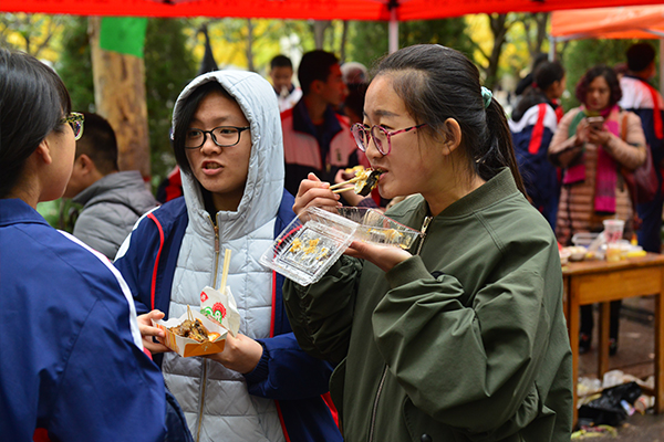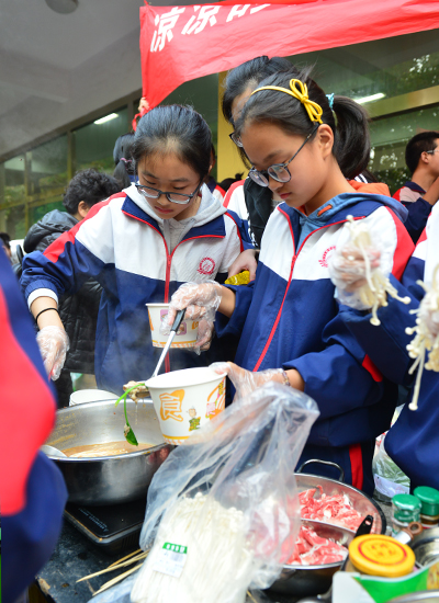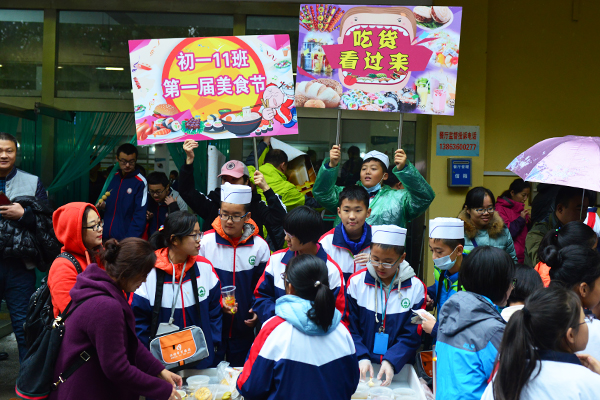 锅碗瓢盆、汤汁酱料已经准备齐全,各摊位忙得热火朝天,椒红叶绿,蒜白姜黄,清蒸爆炒,咸辣酸甜,一路飘香。大厨们都把招牌放在最显眼的位置,有的甚至专门派人站在凳子上举着招牌卖力吆喝。琳琅满目的美食,奇招百出的叫卖,同清香麻辣一起从街头传到街尾,让人垂涎欲滴。还没等到饭点,美食街上已是人山人海,大家游离在美食街,把一个个小摊围得水泄不通,品尝同学们亲手做出来的特色美食。做的人专注忙碌,吃的人悠闲驻足,还有那喉咙虽已嘶哑却仍忘我的叫卖"寿司、奶茶,物美价廉,绝对超值",忙碌与悠闲相互掩映,叫卖声与欢笑声飘荡,交织成一幅有声有色的画面。