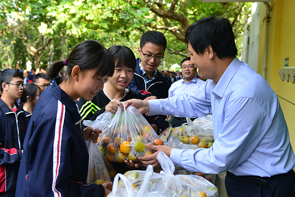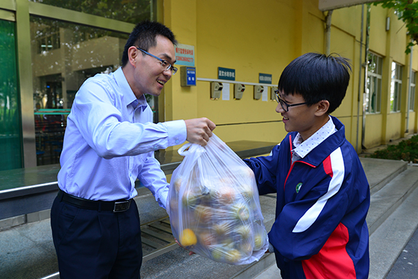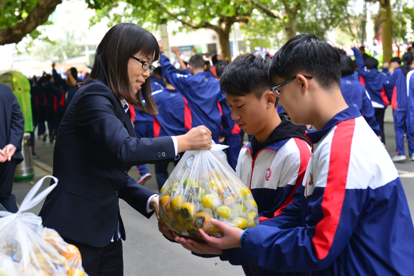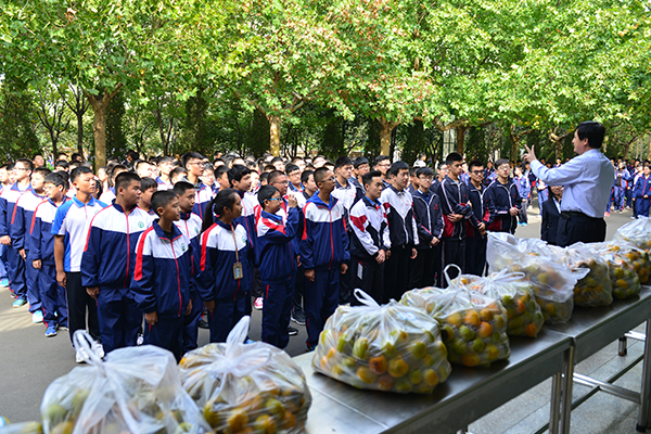 在分发柿子前,张申校长作了简短讲话,他说:"这些甜美的柿子都是自家校园出产的,现在成熟了,请大家带回班里发给其他同学品尝一下,与同学们分享收获的快乐,感受学校这个大家庭的温暖。"不一会儿,一袋袋美味的柿子就全部发到了师生手中,品尝着甜美的柿子,广大师生更深切地体会到了昌乐二中这个大家庭浓浓的亲情文化。