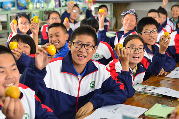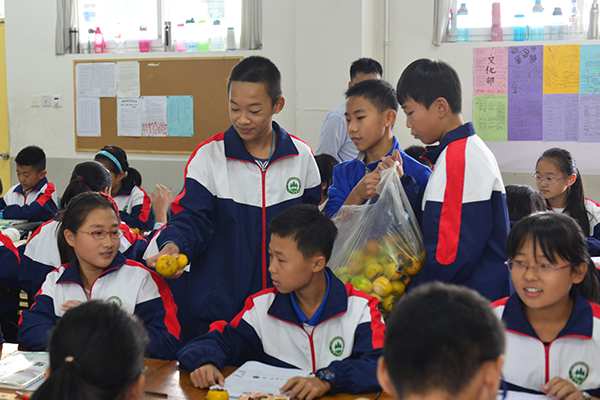 孩子们将柿子发到每个人的手中
