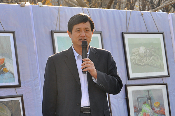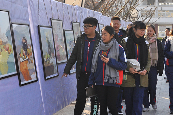 学校还专门组织了高三美术专业生前来学习和观赏指导老师的作品,执行校长张申为他们作了指导。张校长首先肯定了指导老师的作品水平高,思想性、艺术性、观赏性非常强;其次,结合自身经历谈了对美术学习和美术素养的认识;第三,要求同学们认真观展,仔细揣摩和学习借鉴老师们作品的绘画手法和技巧,提高自己的技艺;最后,鼓励大家锲而不舍,忘我学习,为美术联考和校考做好最后的准备。