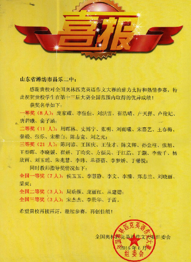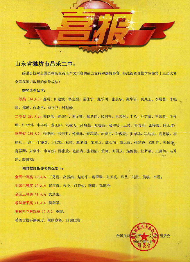 近日,我校接到全国奥林匹克英语作文大赛组委会喜报,山东省昌乐二中在第十三届全国奥林匹克英语作文大赛全国范围内取得优异成绩。我校凭借优异的成绩和良好的组织能力获得"全国优秀组织奖"。其中高一年级和高二年级学生共获一等奖22人,二等奖32人,三等奖55人;教师指导一等奖16人,二等奖8人,三等奖4人,教学能手奖1人,奥林匹克教练员1人。喜报中表达了对我校参赛热情的感谢及对我校学生获奖情况的祝贺。