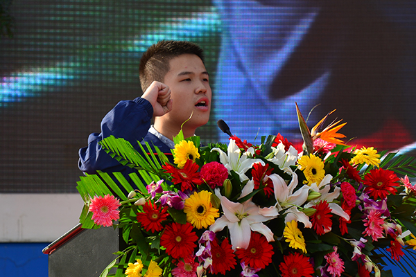 在隆重的升旗仪式后,学生会主席李明彤致开幕词,简要介绍了本次活动的主题、理念、宗旨和项目内容,希望同学们积极参与,"在运动中超越自我、强健体魄、成长心灵;在美食中品味生活、享受文化、启迪智慧"。李宝森副校长在致辞中强调了学校开展体育美食节的目的和意义,他希望同学们在运动中拥有不畏艰难、积极向上的人生态度;体验美食制作的艰辛和售出的喜悦,学会管理,学会经营,学会生活。