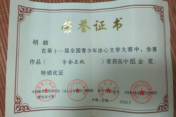 我校高二年级学生胡勍荣获第十一届全国青少年冰心文学大赛金奖