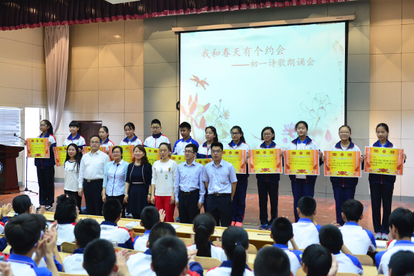 5月7日,我校初一年级在1号报告厅举行“我和春天有个约会”朗诵比赛,全体初一年级师生参加。