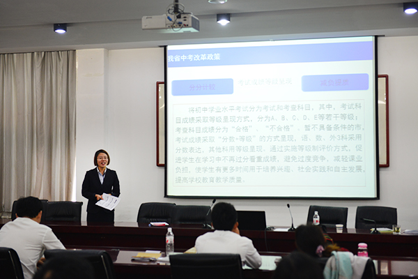 来自外国语学校的黄春吉老师和实验中学的刘红老师分别针对自己学校对于初三复习备考的一些经验和好的做法进行了交流分享。我校马晓印老师传达了山东省教学评价改革会议精神。最后,县教研员高宇老师对复习自测从试题到成绩进行了全面的分析反馈,并对下一步各学校的复习备考进行了指导。