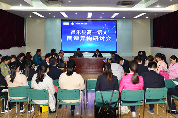 4月11日,昌乐县高中学校发展共同体高一年级“同课异构”课堂研讨活动在我校举行,县教研室领导、教研员,及第中学、昌乐一中、美加实验学校以及我校语文、数学两科教师100多人参加。
