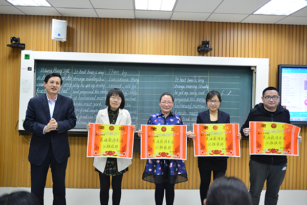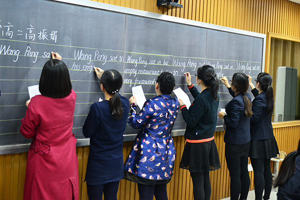 活动中,高三年级徐凤杰老师、高二年级张连霞老师、高一年级刘月霞老师和初中部田爱丽老师分别交流了近期在规范书写方面所做的具体措施,分享了好的经验和做法。随后,老师们进行了书法展示,展示完成后,评委们对老师们的作品进行了点评和评价,评选出了优秀级部和优秀教师并进行了颁奖和奖励。最后,张申校长点评了老师们的书法作品并对全体英语教师进行了培训指导。