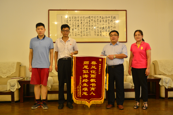 8月17日上午,我校2017届毕业生段浩然和家长,携带锦旗向以其首席导师石志庆为代表的昌乐二中全体教师表示感谢,我校孟维杰副校长、滕玉香主任接待该生及其家长。