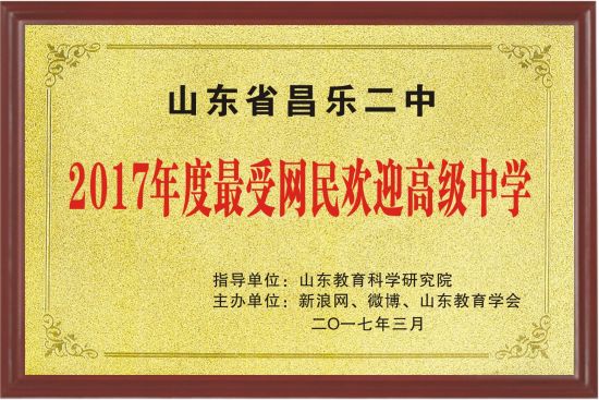 3月31日,由山东省教育科学研究院指导,新浪网、微博、山东教育学会主办,新浪山东承办,山东英才学院协办的“2017年度山东中学教育盛典”在济南隆重举行。我校在本次评选中荣获"2017年度最受网民欢迎高级中学"。在为期7天的全媒体投票中,我校在网络投票环节中始终位居省内前列,受到广大网友的喜爱;在后期专家评议环节中,受到专家们得高度评价和赞誉。最终,我校凭借其雄厚的综合办学实力、优良的百姓口碑荣获该重要奖项!