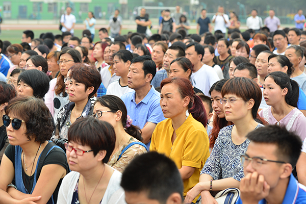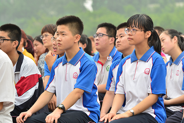 7月5日上午,我校在运动场隆重举行2014级初三学生毕业典礼。学校执行校长张申,副校长刘欣、孟维杰、滕丽红及2014级初三毕业生和家长代表参加典礼仪式。