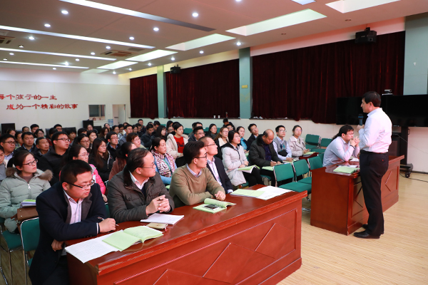 最后,张申校长对我校全体语文教师做培训指导。张校长从研究语文教育的核心与本质、打造学科团队文化、多读书、写随笔、做好达标等方面进行了培训指导。