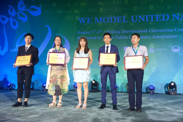 我校代表队以优异的成绩和良好的素养在全球所有队伍中脱颖而出,荣获团体荣誉奖——"最佳组织奖"(全球仅有15支表现优秀的队伍获得该奖项)。会议中,我校学子积极表现,踊跃发言,特别是刘雪纯同学,在GA Special Session(联合国大会特别会议)起草文件、组织谈判过程中表现十分突出,在会场中受到主席团与其他代表的一致认可,获得"荣誉提名奖"(Honorable Mention)。