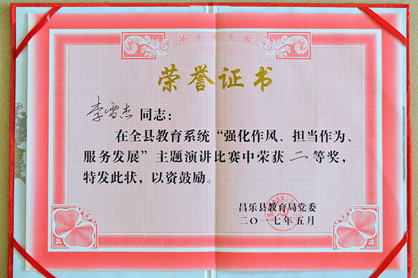 5月24日下午,全县教育系统“强化作风 担当作为 服务发展”主题演讲比赛在外国语学校举行,全县各级各类学校共26名教师参加本次比赛,我校李雪杰老师荣获演讲比赛二等奖。 本次演讲比赛是为全面落实县第十四次党代会和全县作风建设年动员大会精神,推动全县教育系统作风建设持续深化,进一步营造奋发有为、敢于担当、扎实敬业的干事环境。
