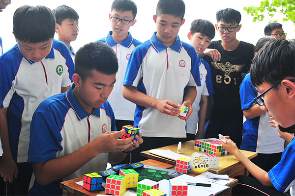 给出一张世界名画在一段时间内进行记忆画的细节,然后在同一张画的一个地方进行小的改动,你能在多短的时间内找出被改动的地方;工作人员打乱魔方的顺序,你能用最短的时间将其将其复原吗;60秒内你能吹爆多少气球;用一根手指转篮球,你能坚持多久;本次吉尼斯擂台赛共设置了音乐类、体育类、美术类、科技类、趣味类共50个活动项目:二中最高音、名画找不同、九连环拆装、平板支撑、下腰过杆、颠足球、篮球技巧赛、掰手腕、跳绳、自行车慢骑、鲤鱼打挺、鸡蛋撞地球、双层气球比赛等等。整个比赛现场高潮迭起,精彩纷呈,同学们不仅热情踊跃地参加比赛,还邀请老师们一起激情挑战,超越自己、挑战极限,不断创造新的纪录。