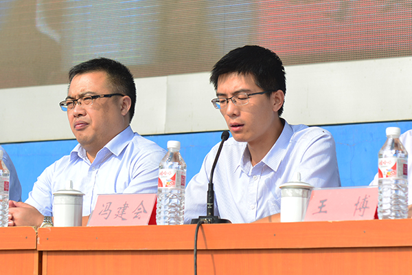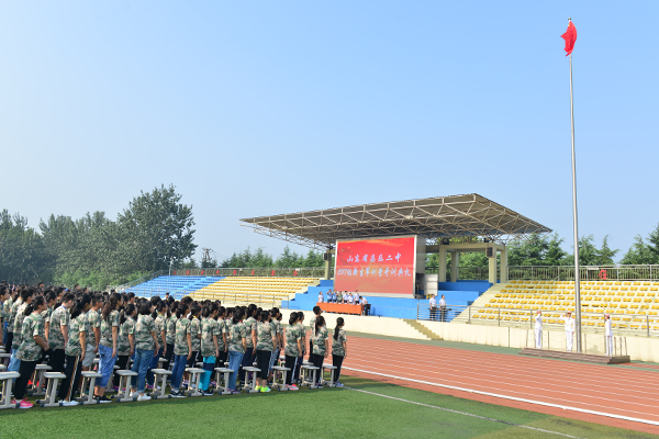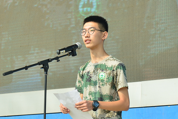 开训典礼在庄严激昂的国歌声中拉开了帷幕,某部队首长作了军训动员讲话;高一年级主任冯建会代表全体师生向承训部队及教官表示诚挚的欢迎和衷心的感谢,他强调了军训课程的重要意义,要求全体师生提高认识,高度重视军训课程;将军事训练同规范养成、思想成长、班级建设、文化引领结合起来,不断增强参与意识、竞争意识和荣誉意识,培养勇敢、坚毅、积极进取的心理素质,树立热爱祖国的民族自尊心、自信心和自豪感。新生代表崔昊源发言,代表全体参训同学庄严承诺:用顽强的意志,强烈的责任感,全力以赴,圆满完成军训课程。典礼最后,承训部队官兵进行了精彩的队列表演。