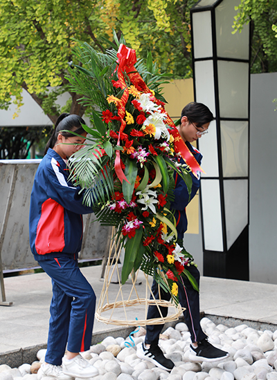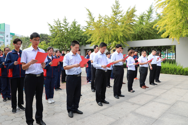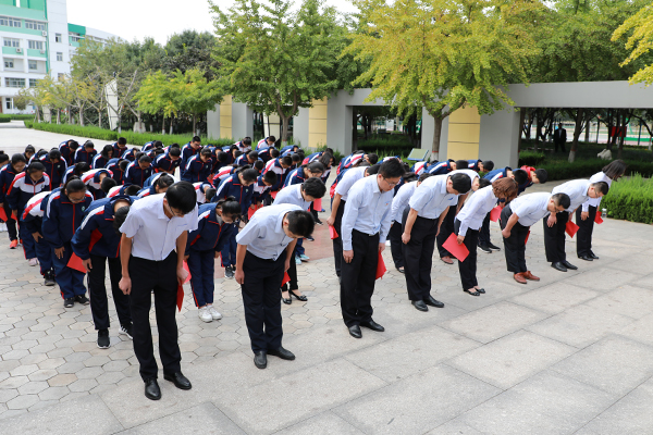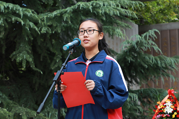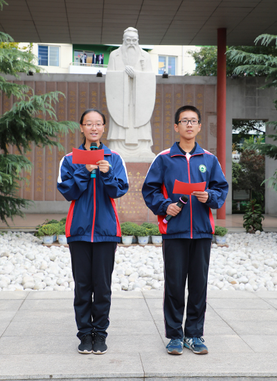 在庄重肃穆的气氛中,教师和学生代表分别向至圣先师孔子敬献花篮,众人鞠躬表达对先师的敬仰。学生代表石镜伟同学发言,号召同学们要向孔子学习,以积极向上的心态去面对我们的学习和生活,努力成长,不断提高综合素质,不负家长嘱托,不负教师教诲,不负民族期望,不负祖国重托,将来成为建设祖国的栋梁之才。张申校长在纪念活动中勉励广大师生,在表达对先师的尊崇与敬仰的同时,要更好地学习儒学文化思想,传播孔子文化,发扬传统文化,增强民族自豪感。他希望同学们认真学习先师教诲,胸怀天下,努力做好事,做好人,成为拥有卓越品质、家国情怀、全球视野的优秀社会公民,为人类社会的发展做出大的贡献!最后,借着缅怀这位至圣先师的契机,全体师生齐诵《论语十则》,一起回味国学经典,感受孔子的思想。