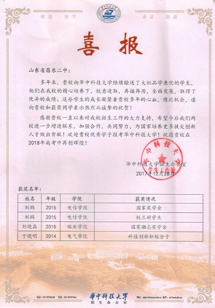 271教育再结硕果。近日,华中科技大学为我校寄来感谢信,感谢我校为其输送的大批优秀学子。我校学子在华中科技大学学习期间,勤奋刻苦,积极参加活动,全面发展,良好的表现受到了全校师生的一致好评。其中,2015届毕业生刘鹏、刘晓磊、于晓明在本学期荣获国家奖学金、校三好学生、国家励志奖学金、科技创新积极分子,受到了华中科技大学领导老师的高度评价。来信中还表示,对我校老师们的辛勤培育表示感谢,希望与我校继续加强联系,深化合作,共同努力,为国家培养更多的拔尖创新人才。