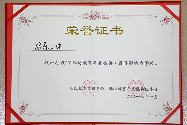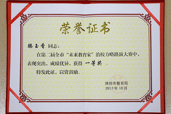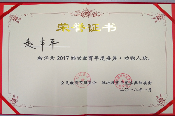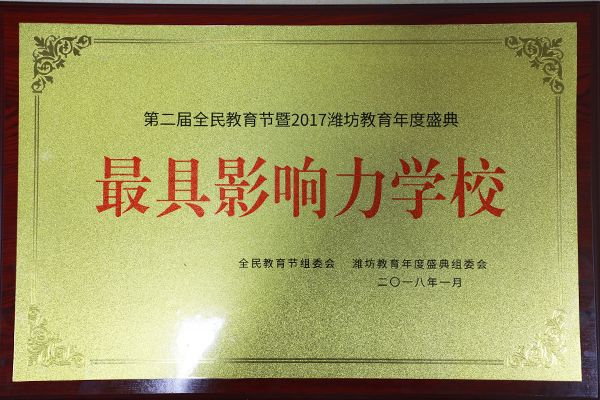 1月20日,第二届全民教育节暨2017年潍坊教育盛典隆重举行。我校凭借雄厚的办学实力和良好的社会口碑,被评为2017年度潍坊市最具影响力学校。赵丰平总校长被评为2017年潍坊市年度功勋人物。我校初中部主任滕玉香荣获潍坊市第二届“未来教育家”路演大赛一等奖。