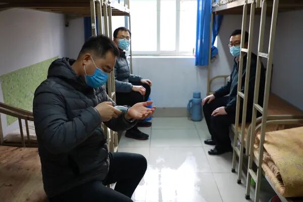 在宿舍演练环节中,“学生”有序排队,在单元楼门口进行足部、手部消毒,在宿舍内由舍长组织进行体温测量,并如实记录体温。“学生”离开后,由专人进行开窗通风,对宿舍进行消毒。