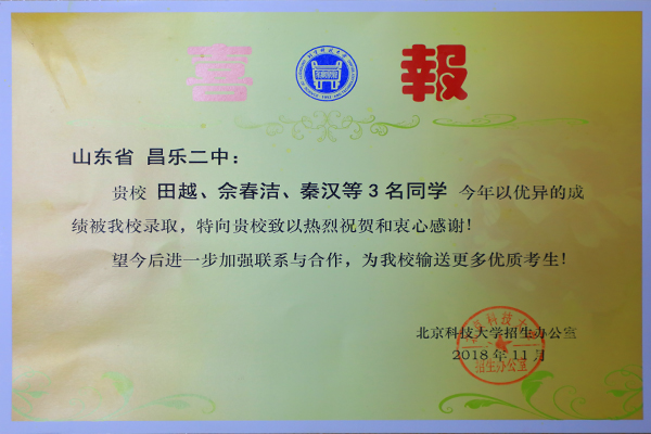 感谢信 近日,北京科技大学为我校寄来感谢信,感谢我校为其输送的大批优秀学子。我校2018年高考成绩斐然,硕果累累。田越、佘春洁、秦汉3名学生以优异成绩被北京科技大学录取。他们在大学学习期间,勤奋学习,积极参加活动,全面发展,良好的表 ...
