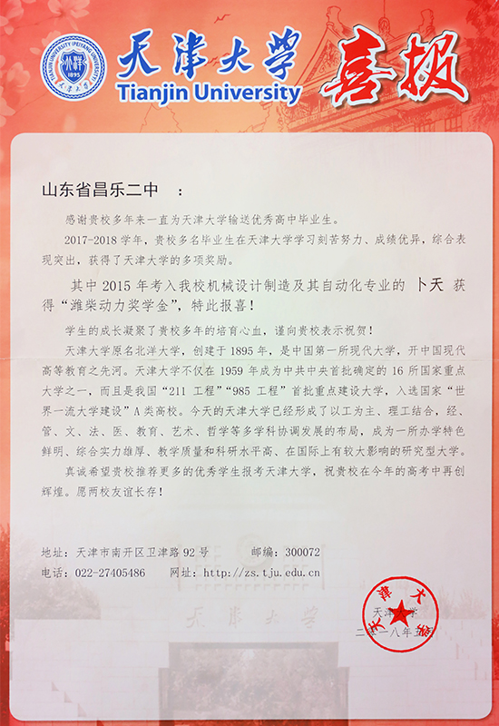 271教育结硕果。近日,天津大学为我校发来感谢信,感谢我校为其输送的大批品学兼优的毕业生。来信中提到:2017-2018学年,我校多名学生在天津大学学习刻苦努力,成绩优异,综合表现突出,获得了天津大学的多项奖学金。其中,我校2015届毕业生卜 ...