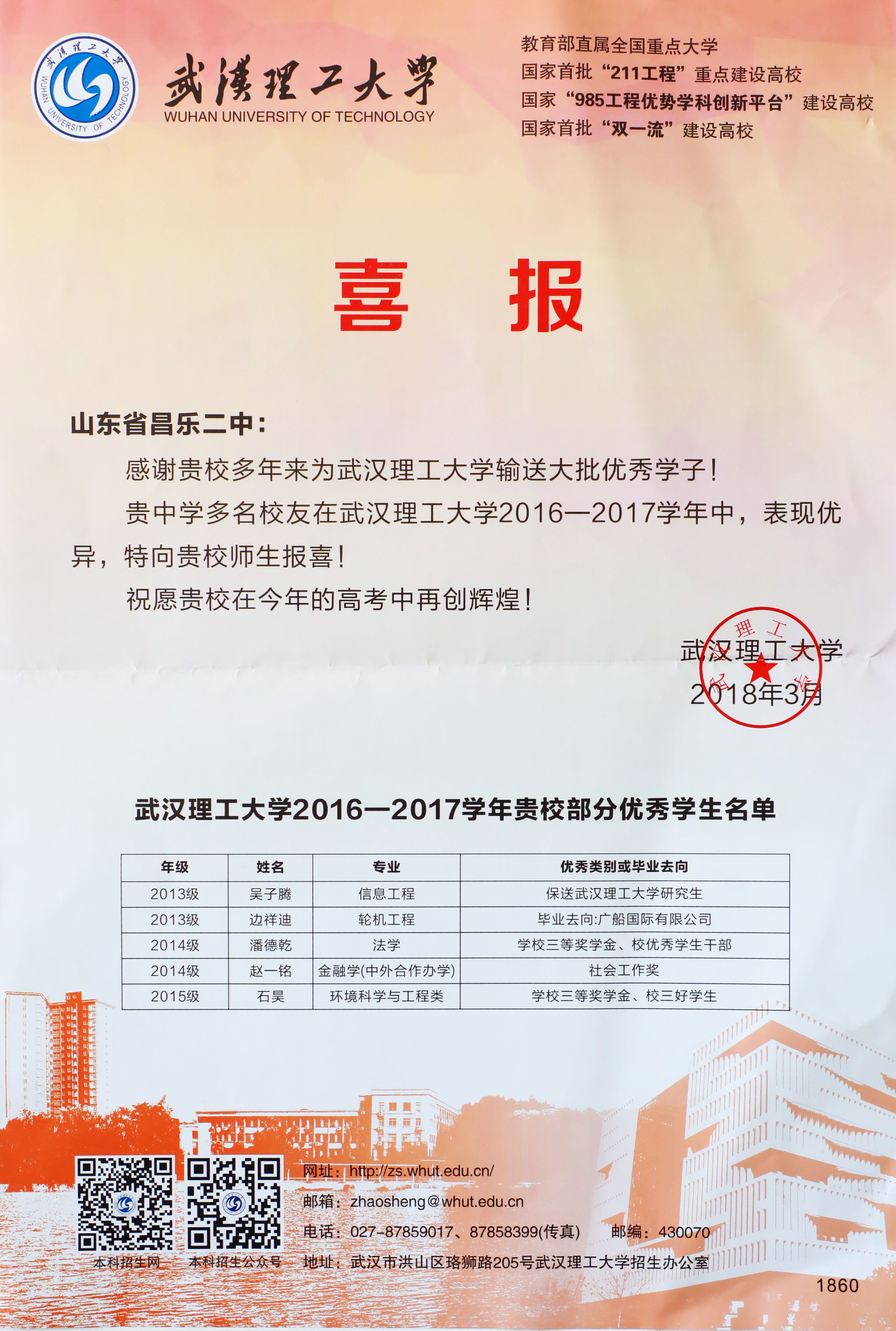 271教育结硕果。近日,武汉理工大学为我校寄来感谢信,感谢我校为其输送的大批优秀学子。我校学子在大学期间,勤奋学习,积极进取,在德、智、美等方面全面发展,良好的表现受到了全校师生的一致好评。其中,2013届毕业生吴子腾、边祥笛,2014 ...