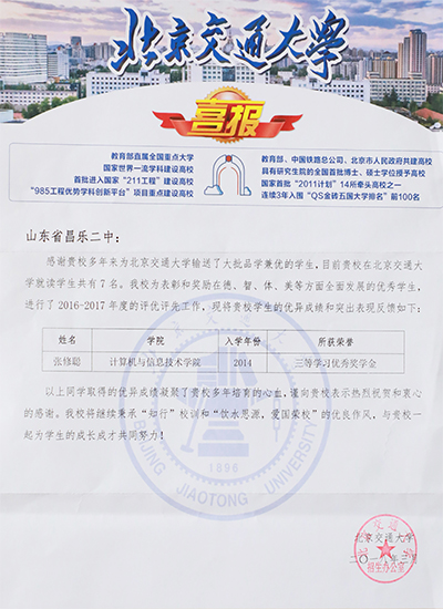 271教育再结硕果。近日,北京交通大学为我校寄来感谢信,感谢我校为其输送的大批优秀学子。目前我校共有7名学子在北京交通大学就读,在校学习期间,勤奋学习,积极参加活动,在德、智、美等方面全面发展,良好的表现受到了全校师生的一致好评 ...