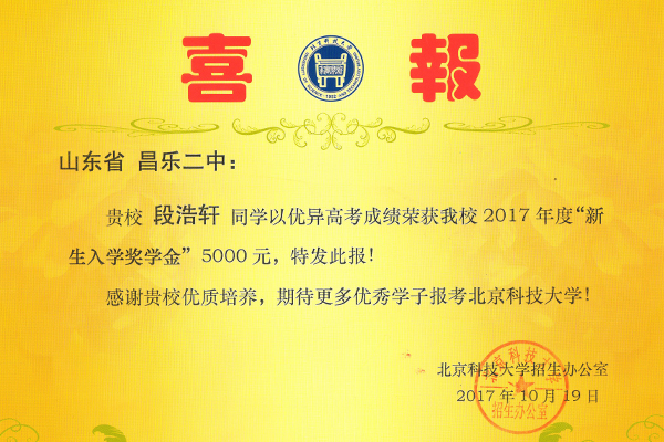 近日,我校收到北京科技大学寄来的感谢信,我校优秀毕业生段浩轩同学以优异高考成绩获得北京科技大学2017年“新生入学奖学金”5000元。特此感谢我校的优质培养,并期待我校更多的优秀学子报考北京科技大学!