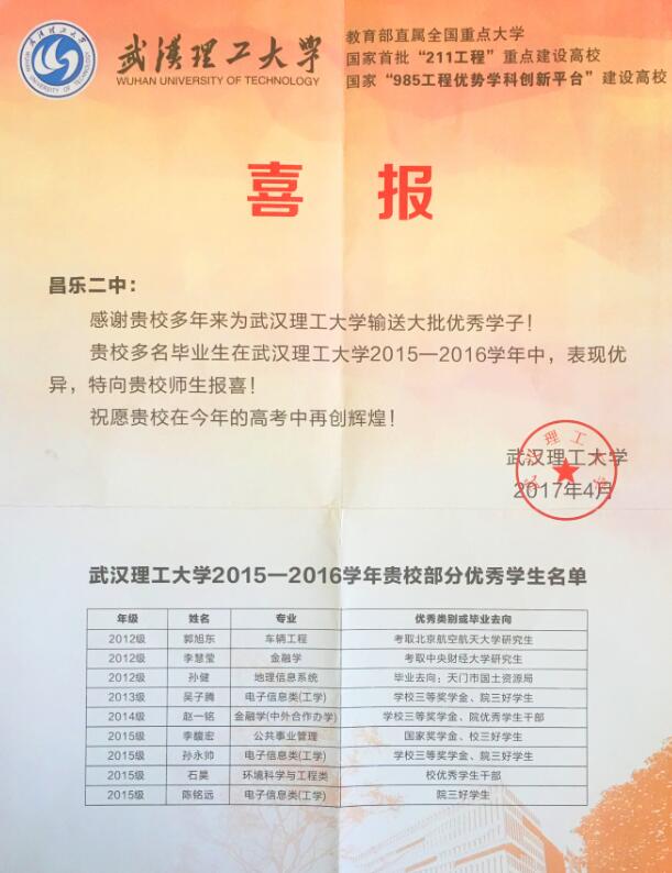 近日,武汉理工大学给我校发来感谢信,感谢我校多年来为武汉理工大学输送的大批优秀学子,并祝愿我校再创辉煌。
