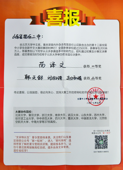 近日,全国中小学生创新作文大赛组委会传来喜讯,我校学子在第12届全国中小学生创新作文大赛中喜获佳绩。我校有52名学子在创新作文大赛复赛中表现优异,其中苗译文同学斩获一等奖,赵雨晴、刘淑琦、韩天舒三名同学获得二等奖,刘烜、魏龙飞 ...